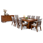 Las ocho sillas complementan el conjunto con una silueta cómoda y estilizada, pensadas para largas sobremesas sin sacrificar diseño, mientras que el buffet añade funcionalidad con una presencia sólida y decorativa que enriquece cualquier espacio.